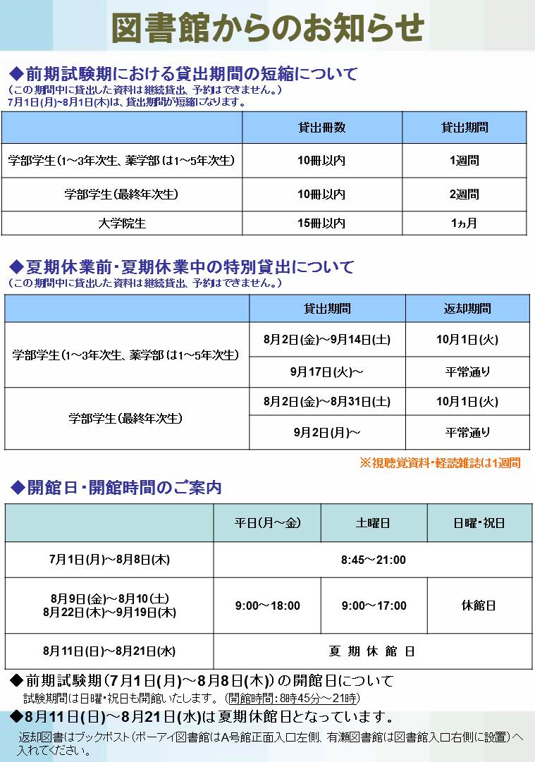 2019年度前期試験期のための開館時間・貸出期間の変更について