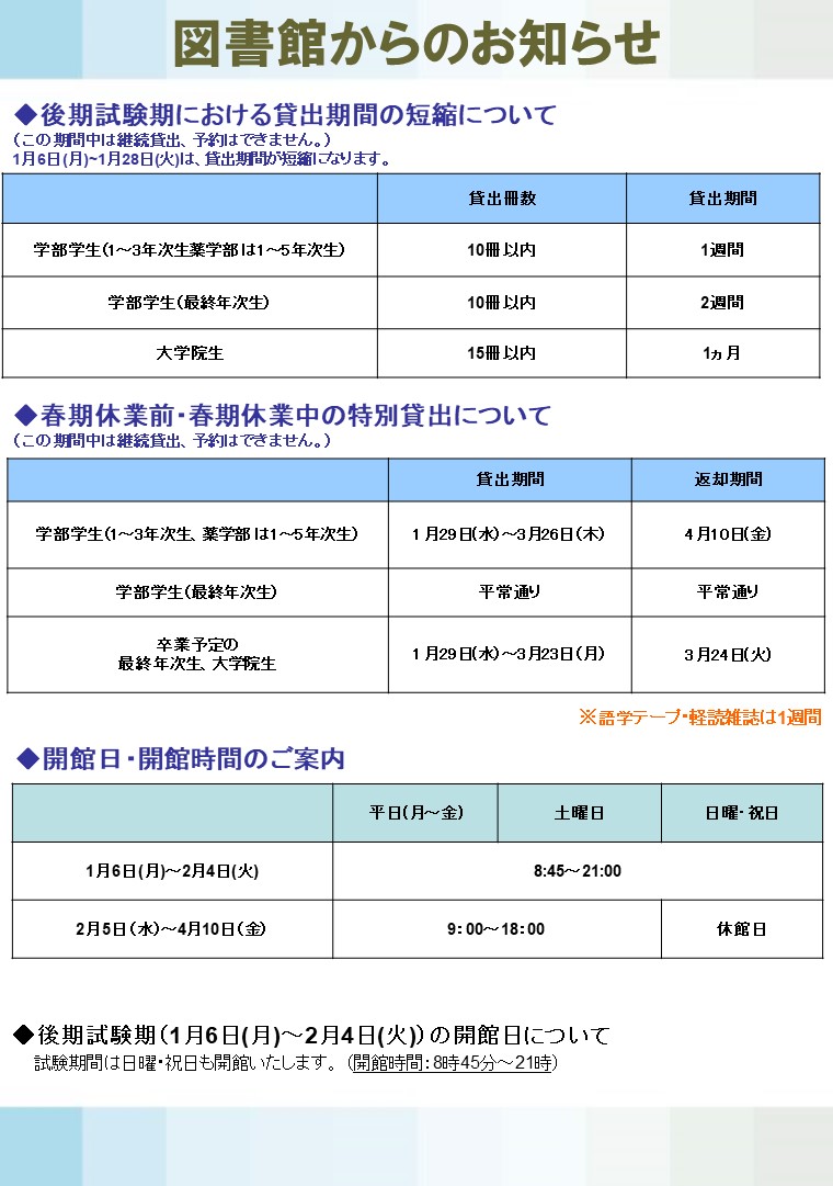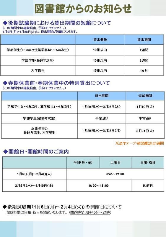 2019年度後期試験期のための開館時間・貸出期間の変更について