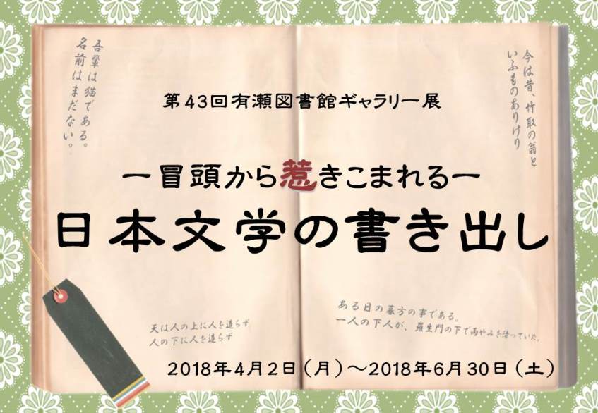 今回の有瀬図書館ギャラリー展では、「-冒頭から惹きこまれる-日本文学の書き出し」と題し、『枕草子』『吾輩は猫である』など、冒頭部分が有名な文学作品を展示しています。書き始めの文章に注目していただき、その先に続く話の展開を予想しながらお楽しみください。 これらの資料は普段は閉架資料として、閲覧が制限されているものです。 この機会にぜひご覧ください。