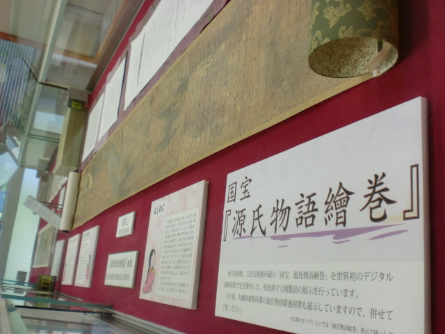 今回の展示では、徳川美術館および五島美術館所蔵の「国宝 源氏物語繪巻」を世界初のデジタル最新技術で完全復刻した、原色原寸の複製絵巻を展示しています。源氏物語をよく知らないという人も楽しめるようにパネルにて紹介しています。また、新館2階円形コーナーでは、貸出可能な資料も展示しています。高雅典美な王朝絵巻の世界をお楽しみください。