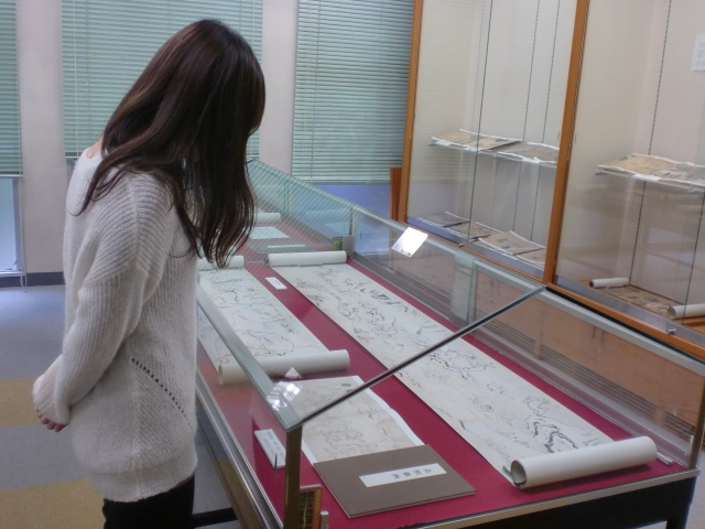 今回の有瀬図書館ギャラリー展では「絵巻物の世界」と題して、日本四代絵巻とよばれる『源氏物語絵巻』『信貴山縁起』『伴大納言絵巻』『鳥獣人物戯画』を主軸に、さまざまな作品を展示しています。