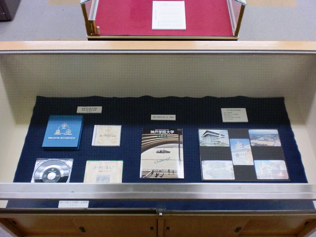 今回の有瀬図書館ギャラリー展では、「神戸学院大学 50周年のあゆみ」と題し、これまで神戸学院大学で発行された刊行物や記念品を展示しています。