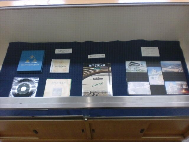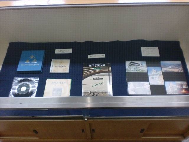 今回の有瀬図書館ギャラリー展では、「神戸学院大学 50周年のあゆみ」と題し、これまで神戸学院大学で発行された刊行物や記念品を展示しています。これらの資料は学内で今も目にする物から図書館で保管されてきた発行当時の物まで様々な物を揃えています。これらの資料を通してこれまでの神戸学院大学のあゆみを振り返りながらより本学に親しみいただければと思います。