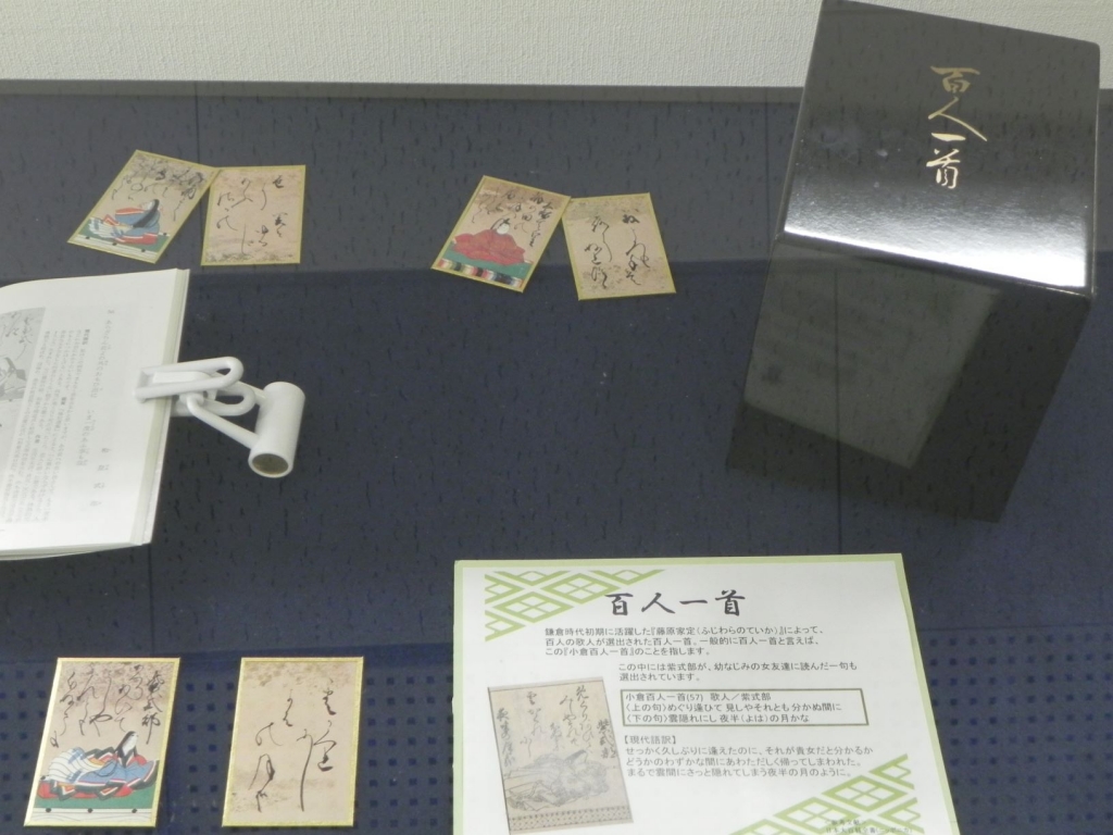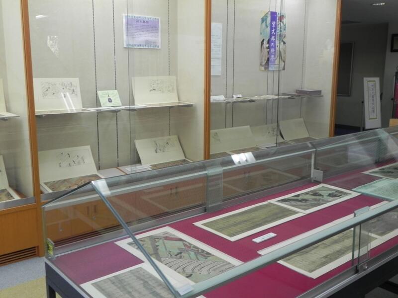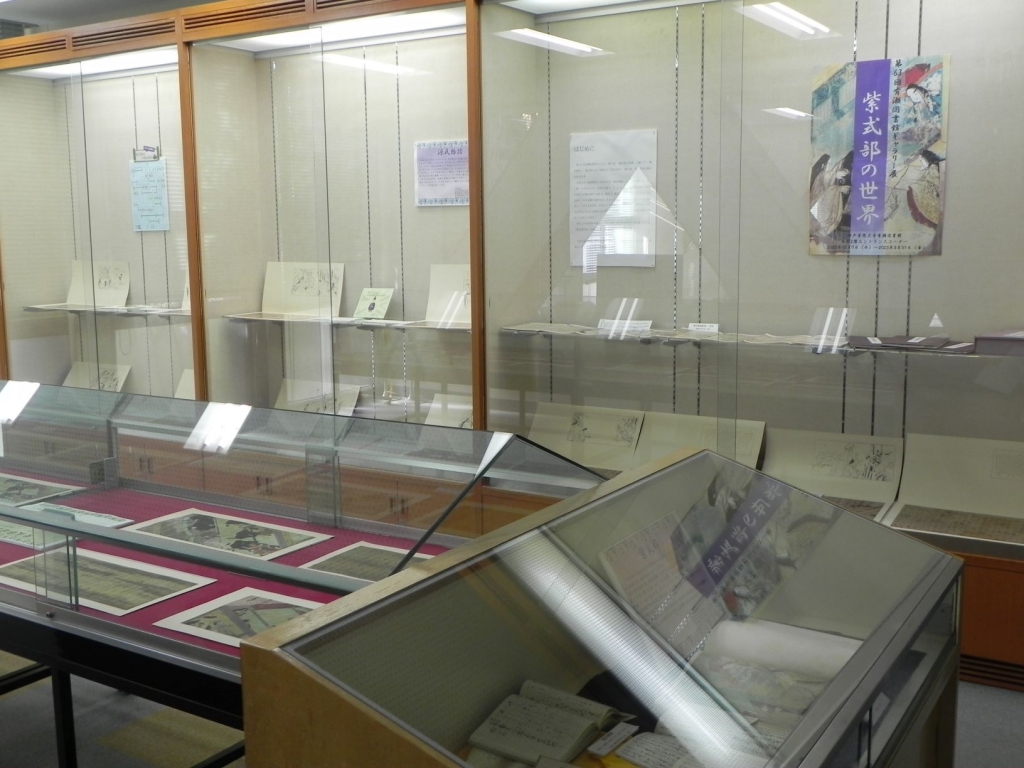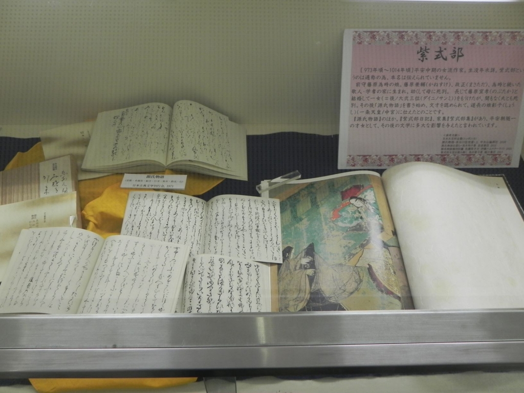 「紫式部の世界」と題して、「源氏物語」・「紫式部日記」を展示しております。「紫式部」は、平安中期の女流文学者です。日本文学の最高傑作とも称される「源氏物語」と、「紫式部日記」は、一条 (いちじょう) 天皇中宮彰子 (しょうし) (藤原道長娘)のもとに出仕した紫式部が1008年(寛弘5)秋から10年(寛弘7)正月に至る足掛け3年の見聞や感想を記したものになり、中宮彰子(しょうし)の女房として仕えた作者が、生活などを客観的に描きながら、華やかさになじみきれない自己の苦悩をものぞかせ、作者の人間性を知る貴重な資料であるといわれています。