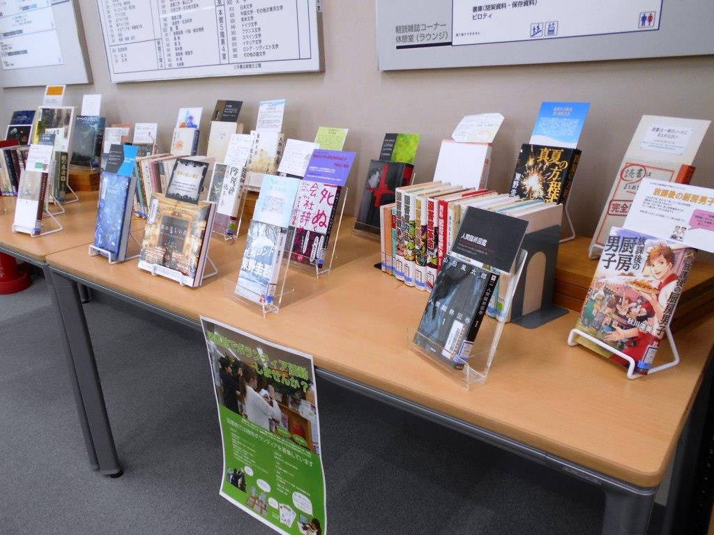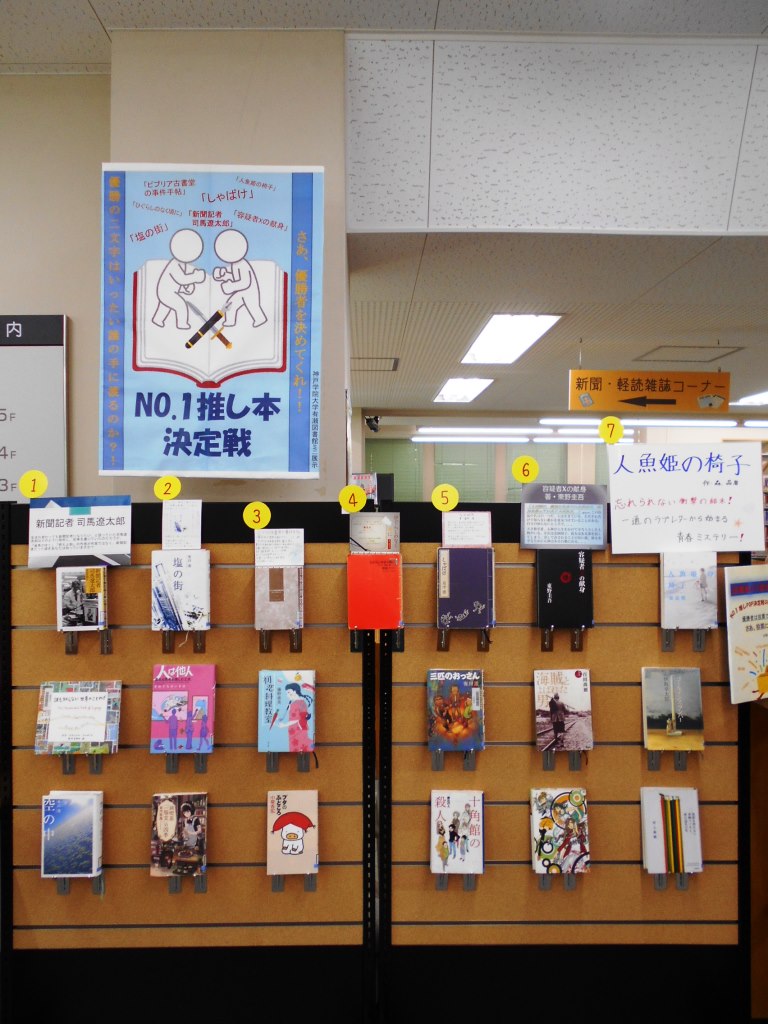 現在、ミニ展示にて神戸学院大学生ボランティアが選んだ推し本とボランティアが作成したPOPを展示しています。また特に気合を入れて作成したPOPを作成者自らが選び出し、みなさんの投票で、どのPOPが最も良かったか対決する企画を行っています。