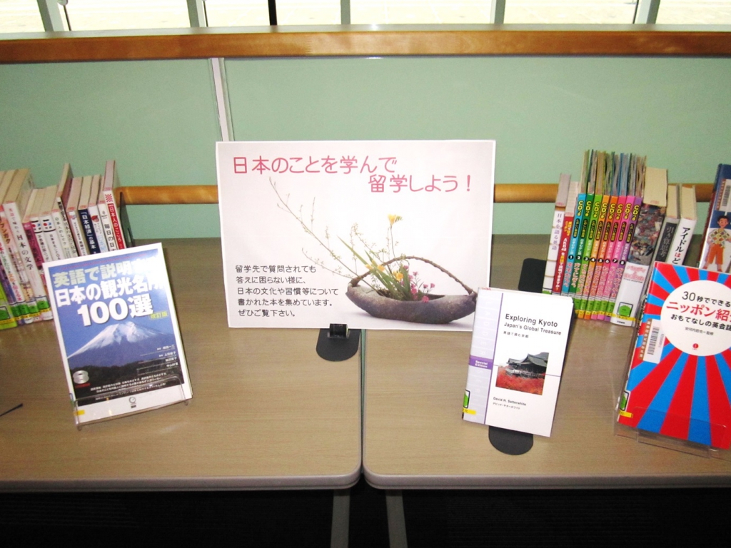 図書館では、4月から半年間留学するグローバル・コミュニケーション学部新3年次生の皆さんにむけて、留学先で日本のことを質問されても困らないように、日本について英語で紹介する本を集めて展示しています。歴史、経済、文学などの堅い本から、和食や漫画まで色々揃えました。