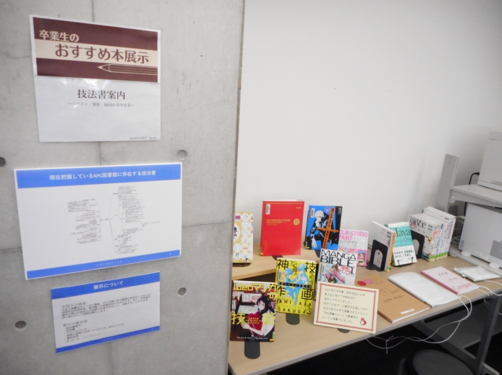 2019年3月卒業生が、新入生に向けておすすめ本を展示して下さいました。こちらの卒業生は、図書館のイベント「学生選書ツアー」で、興味のあるゲーム業界分野の本をたくさん選書されました。ぜひご覧ください。