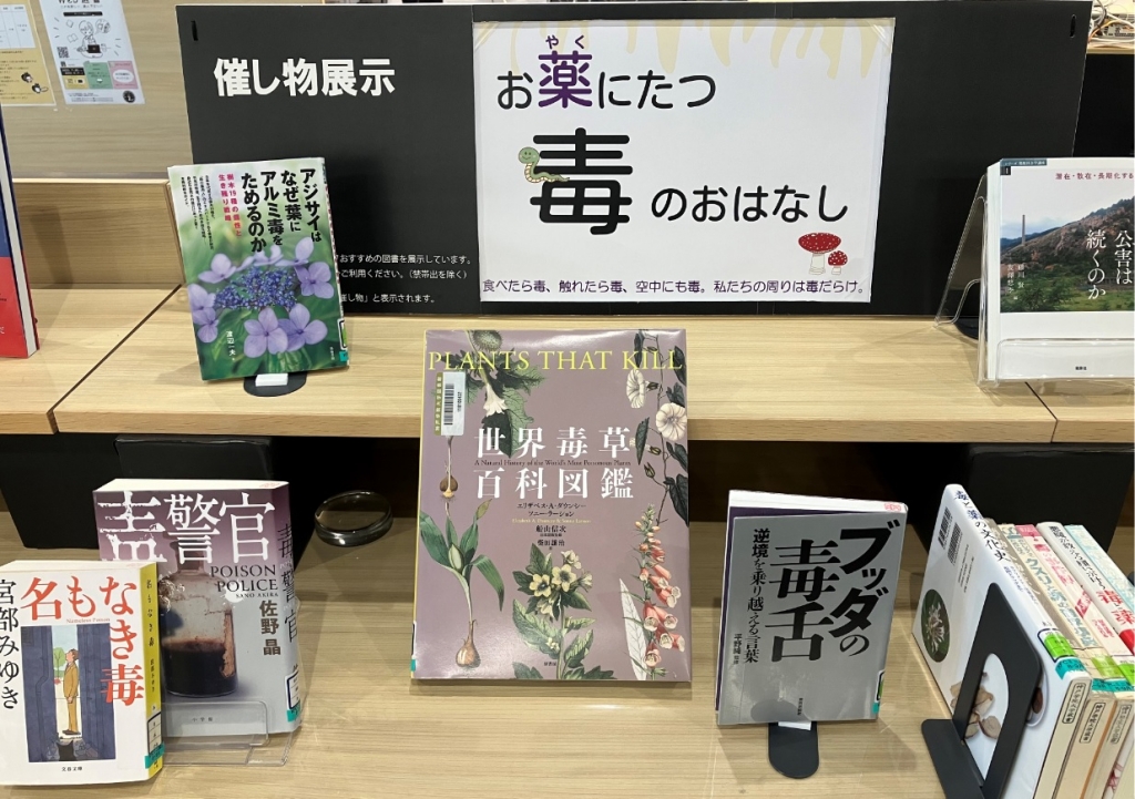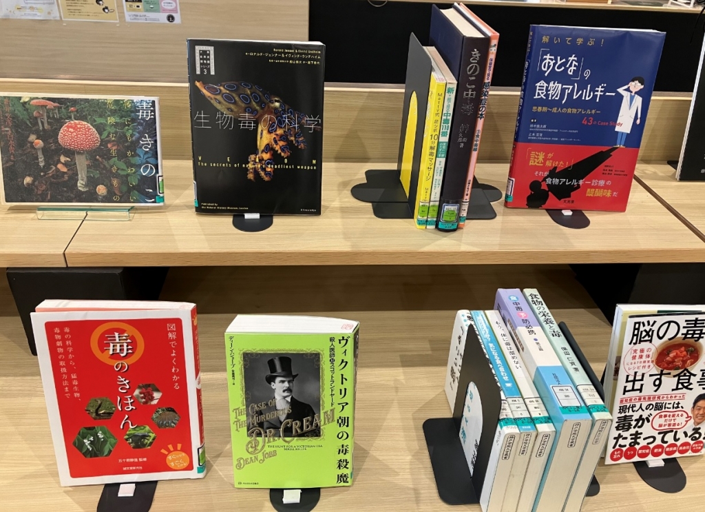 食べたら毒、触れたら毒、空中にも毒。私たちの周りは毒だらけ。それらは用量により毒にも薬にもなります。クスリとリスク。身の回りの毒にまつわる話や、姿は美しいのに毒を持つ生物の資料など、毒というキーワードで幅広く揃えました。