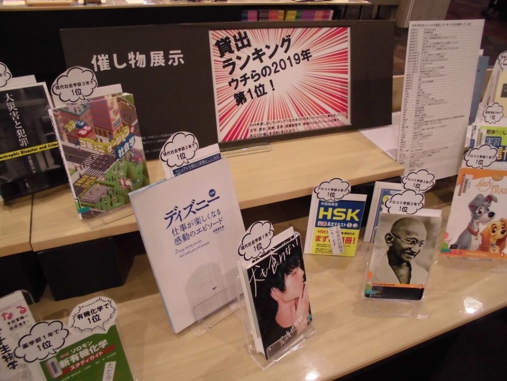 2019年の貸出が最も多かったランキング1位の本とDVDを、ジャンルごとに集めました。文学、歴史、法律、医療、芸術、図書館留学、映画DVDなどジャンルは様々。学部別貸出ランキング1位も展示しています。あなたの推し本はありましたか?