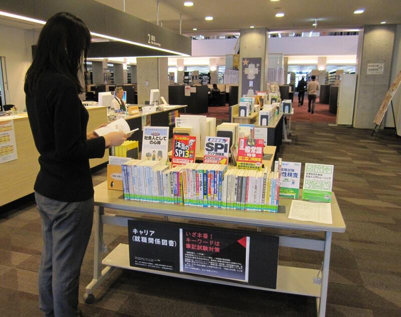 図書館では、エントリーシートの書き方や一般常識・時事問題の対策、就職活動に役立つビジネスマナー、新聞の賢い読み方の本を展示しています。