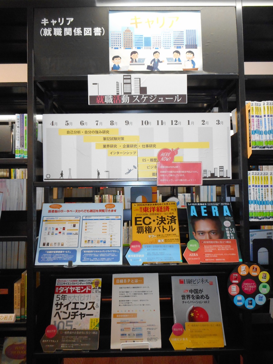 そこで今回の展示では、就活の情報収集に役立つ、雑誌とデータベースを紹介します。