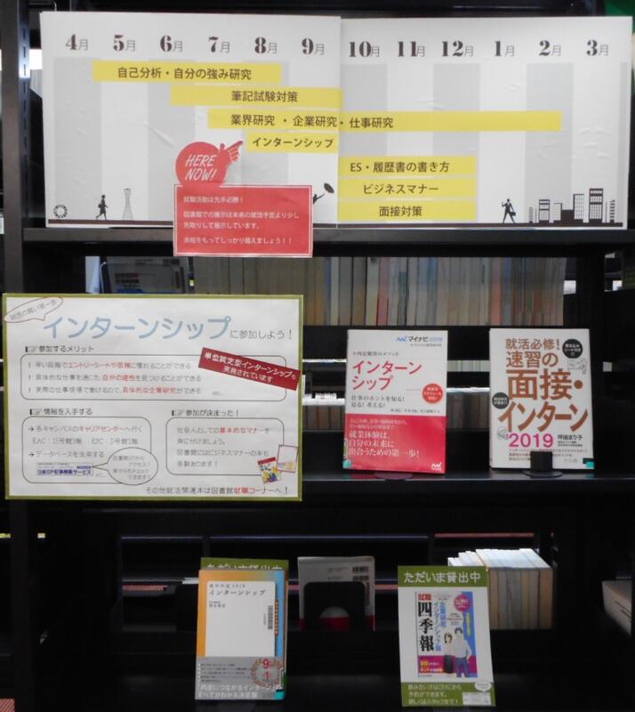 新年度も数か月が過ぎました。3回生の方の中には、もう就活を始めている人もいるのではないでしょうか。そこで、就活の一つとして「インターンシップ」に参加してみませんか?就活に役立つ経験ができ、自己分析にも活かせます! また就活コーナーには各ジャンルの対策本もありますので、そちらも活用してみてください。