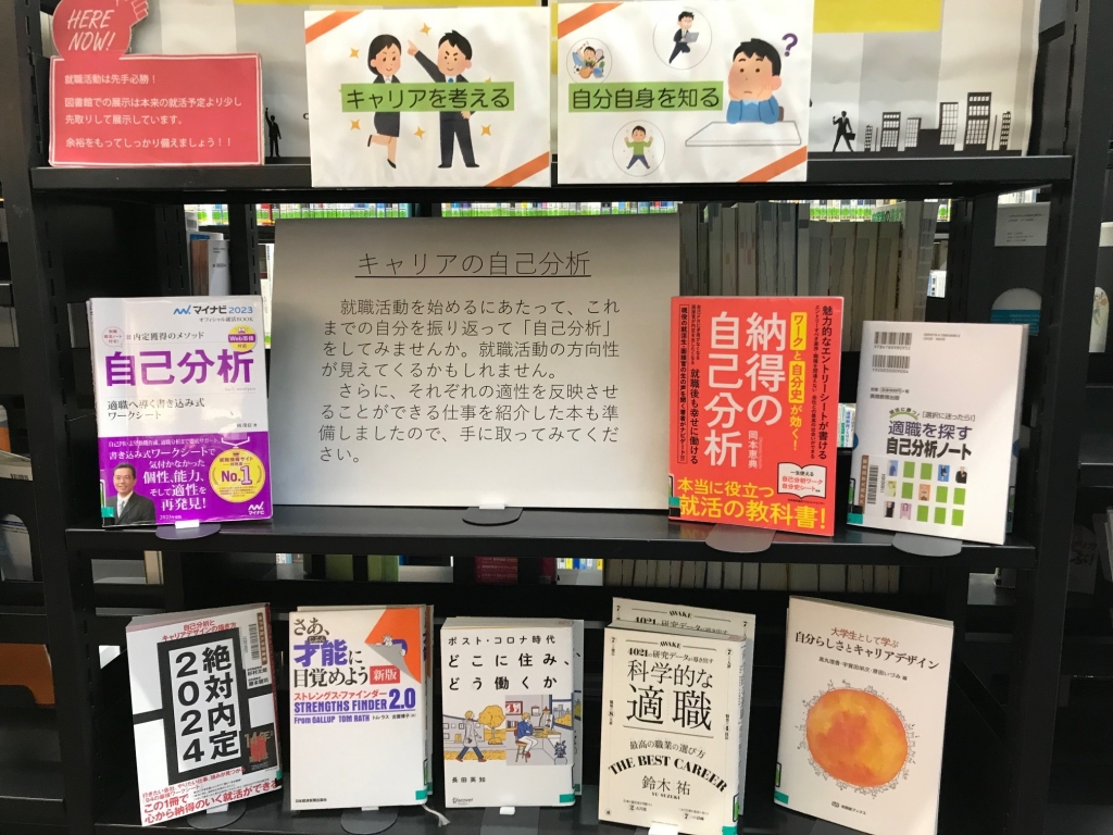 まず、これまで行ってきたことを「自己分析」してみませんか。今回のキャリア展示では、自己分析の本を集めました。自分の希望する進路や適性がみえてきます。