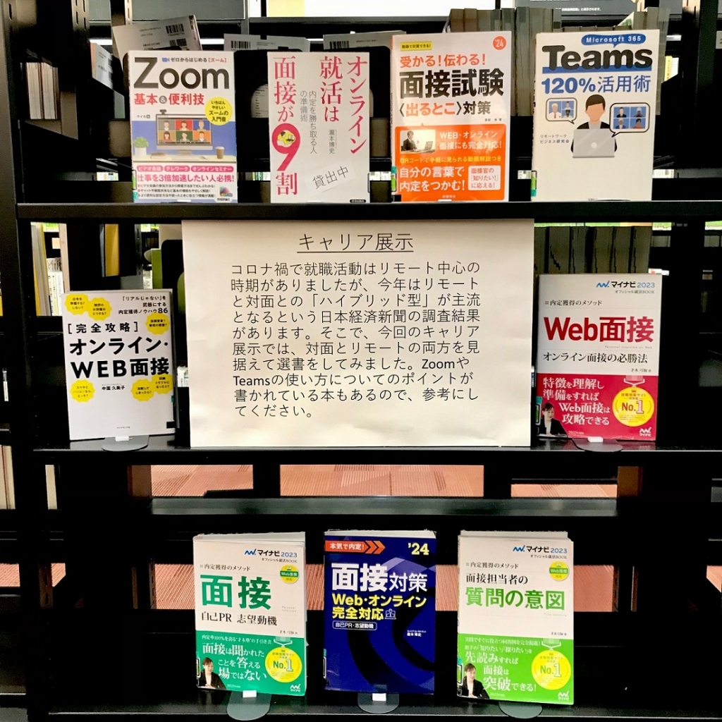 コロナ禍で就職活動はリモート中心の時期がありましたが、今年はリモートと対面との「ハイブリッド型」が主流となるという日本経済新聞の調査結果があります。そこで、今回のキャリア展示では、対面とリモートの両方を見据えて選書をしてみました。ZoomやTeamsの使い方についてのポイントが書かれている本もあるので、参考にしてください。