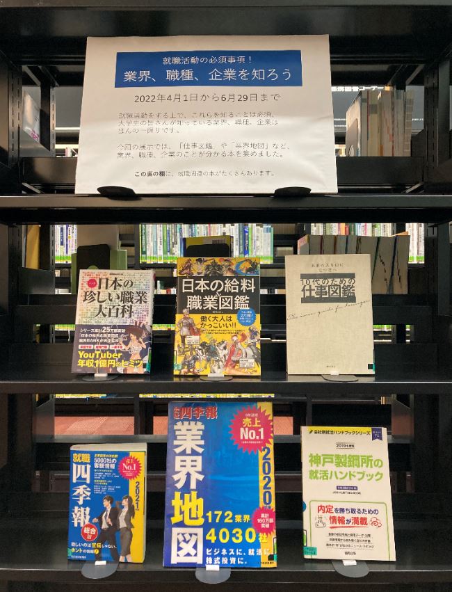 今回の展示では、「仕事図鑑」や「業界地図」など、業界、職種、企業のことが分かる本を集めました。