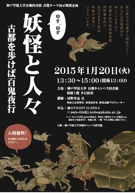 | 日時:2015年1月20日(火) 13:30~15:00(13:00 受付開始) 会場:神戸学院大学有瀬キャンパス図書館 新館1階 多目的室 参加:無料(事前申込みが必要です) 主催:神戸学院大学有瀬キャンパス図書館 講師:河野 隼也氏 妖怪藝術団体百妖箱、代表。 妖怪アートフリマモノノケ市、世話役。 嵐電妖怪電車、プロデューサー。 京都一条妖怪ストリート、プロデューサー兼HP管理人。