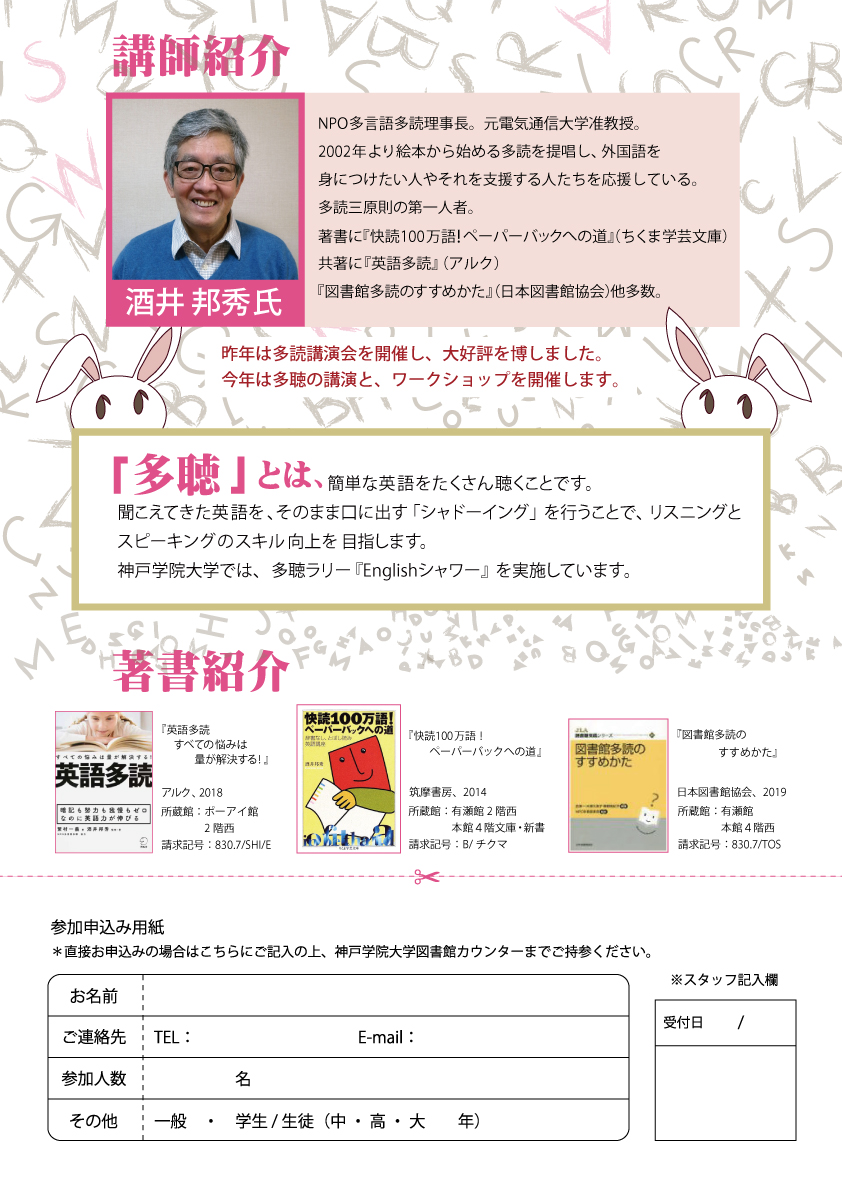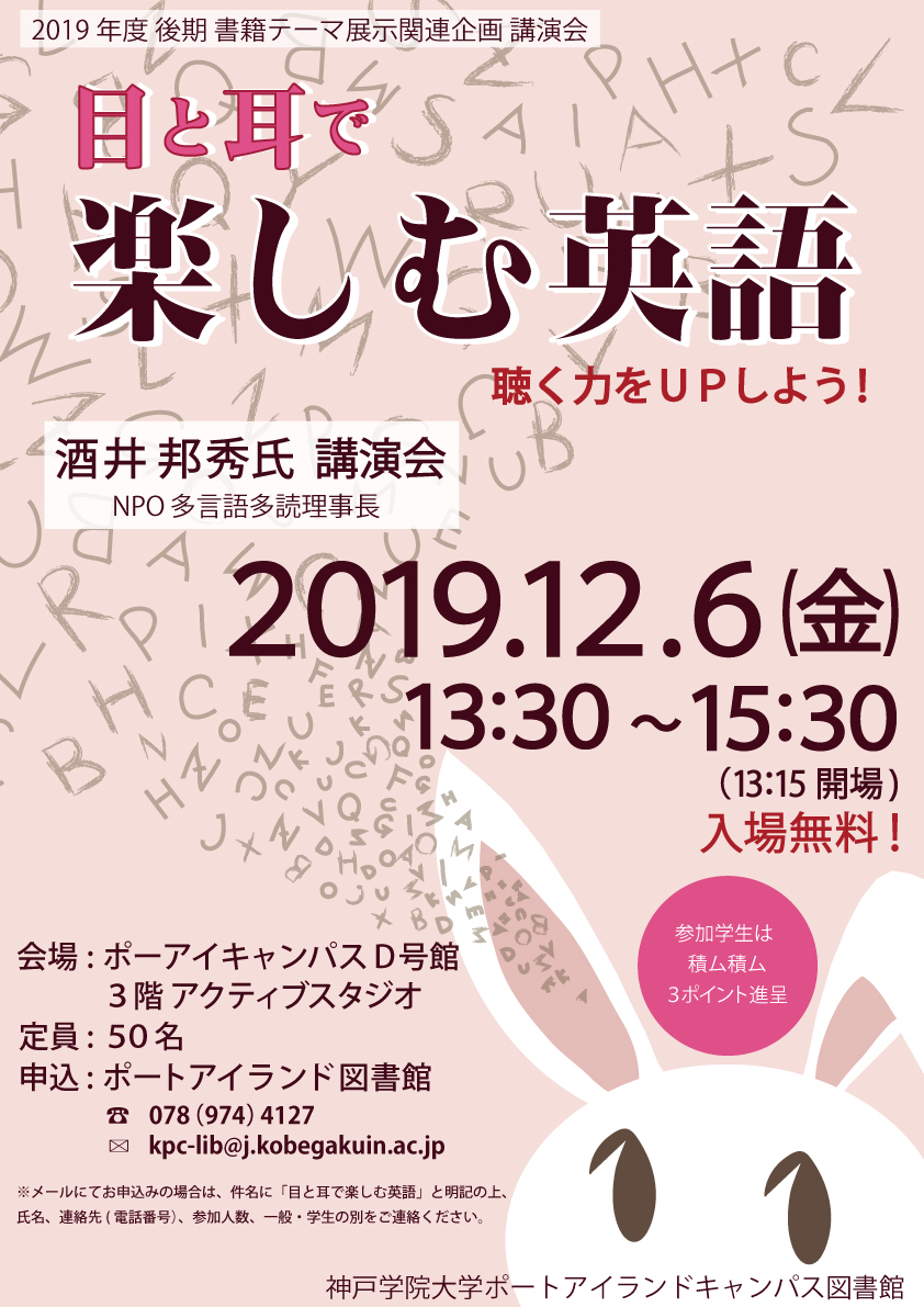 日時:2019年12月6日(金) 13:30~15:30(13:15開場) 会場:神戸学院大学ポートアイランドキャンパスD号館 3階アクティブスタジオ 参加:無料(事前申込みが必要です) 講師:NPO多言語多読理事長 酒井邦秀氏 お申込み・お問い合わせ先 神戸学院大学ポートアイランドキャンパス図書館 TEL:078(974)4127 FAX:078(974)4129 E-mail:kpc-lib@j.kobegakuin.ac.jp どなたでもお気軽にご参加いただけます。参加ご希望の方は①氏名②連絡先(電話番号・E-mail) ③人数④一般/学生の別をご連絡ください。 FAX/E-mailでお申込みの際は、件名に「酒井邦秀氏講演会」と明記ください。 |