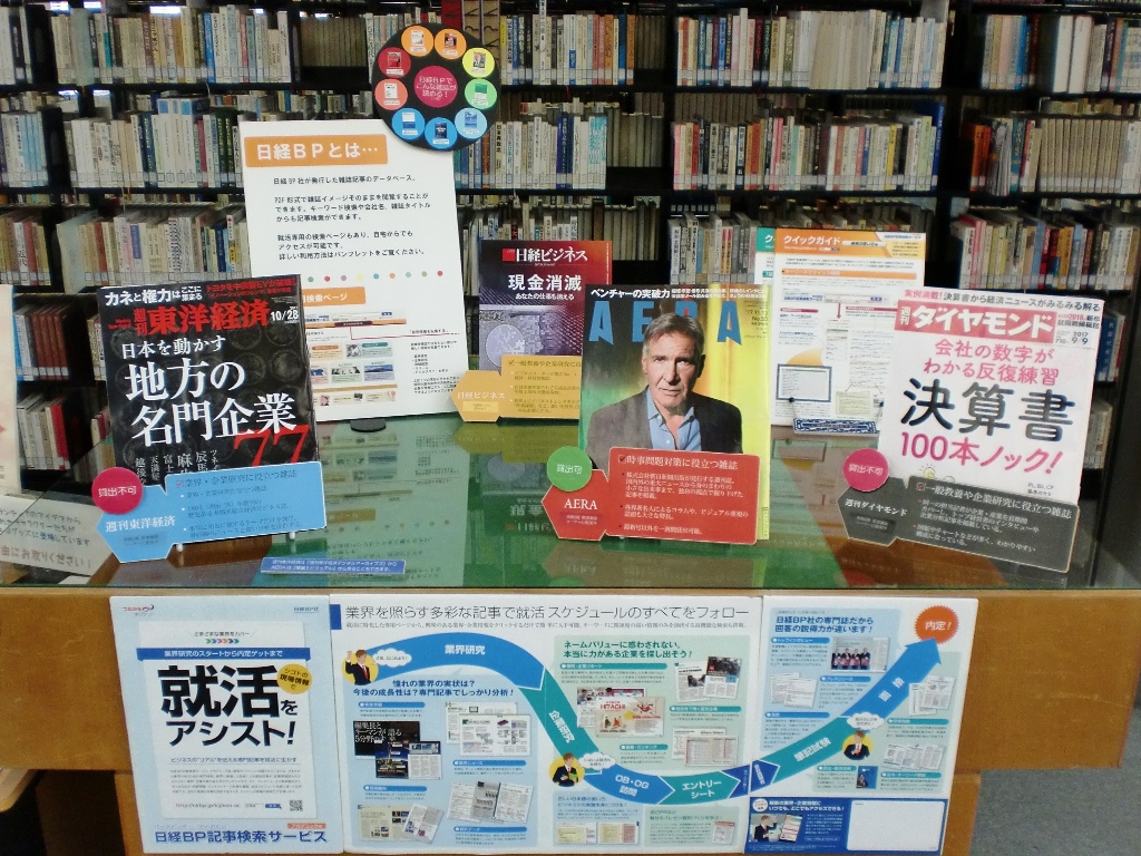 今回の展示は、就活の情報収集に役立つ、雑誌とデータベースを紹介しています。「就活は情報戦」といわれるほど、重要な情報収集です。得意分野の異なる雑誌やデータベースを使いこなして、自分に必要な情報を効率的に収集しましょう。