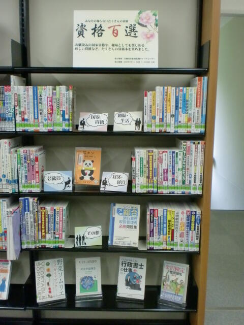 今回の展示では、みなさんがよく知っている社会福祉士などの国家資格から、日本茶検定など趣味としても楽しめる珍しい資格まで、さまざまな資格本を集めました。