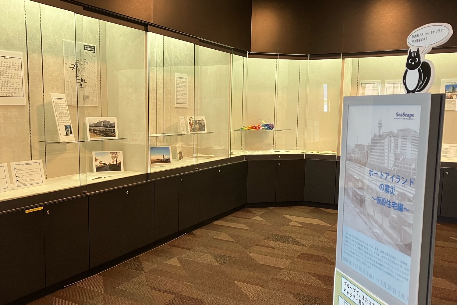 現代社会学部 社会防災学科3年次生が阪神・淡路大震災における『ポートアイランドの震災~仮設住宅編~』の展示をしてくれました。