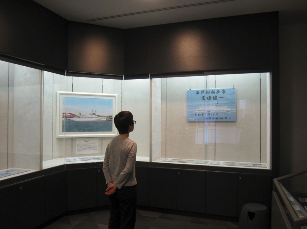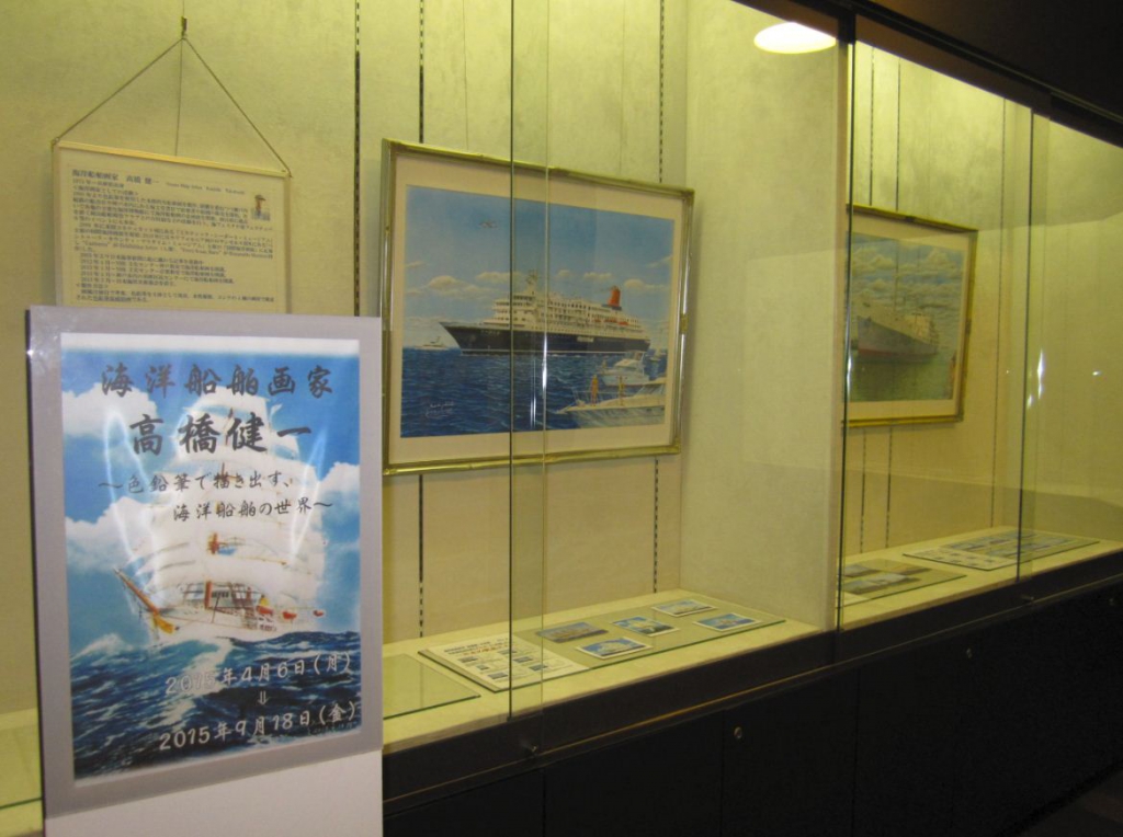 第16回 神院大-神戸海洋博物館資料展では、海洋船舶画家・高橋健一氏の作品を展示しています。今回展示している絵画やポストカードには、往年の日本の商船や帆船から各国で活躍するクルーズ客船まで、様々な船が描かれています。