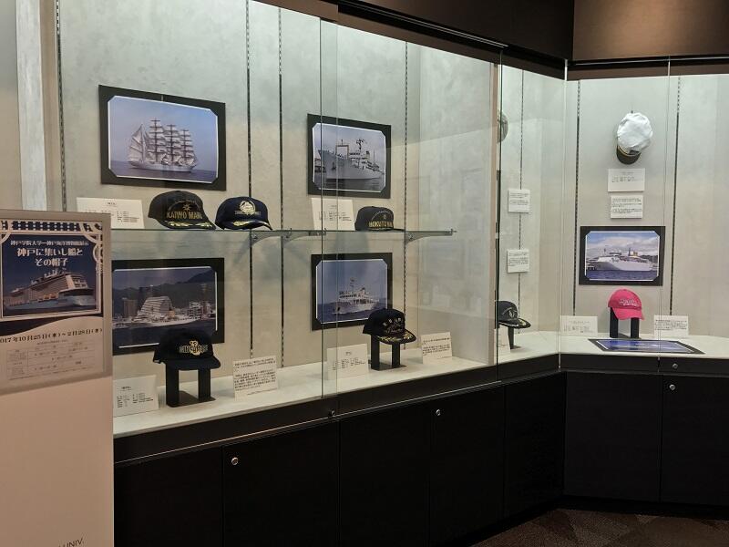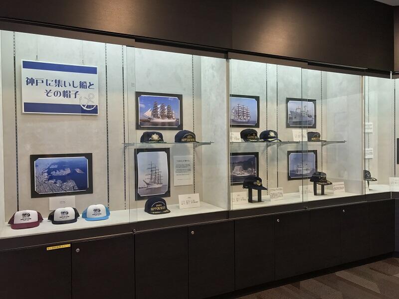 第21回 神院大-神戸海洋博物館資料展では、神戸開港150年を記念して、船の写真に乗務員が着用する帽子や乗船記念の帽子を添えて展示しております。是非ご鑑賞ください。